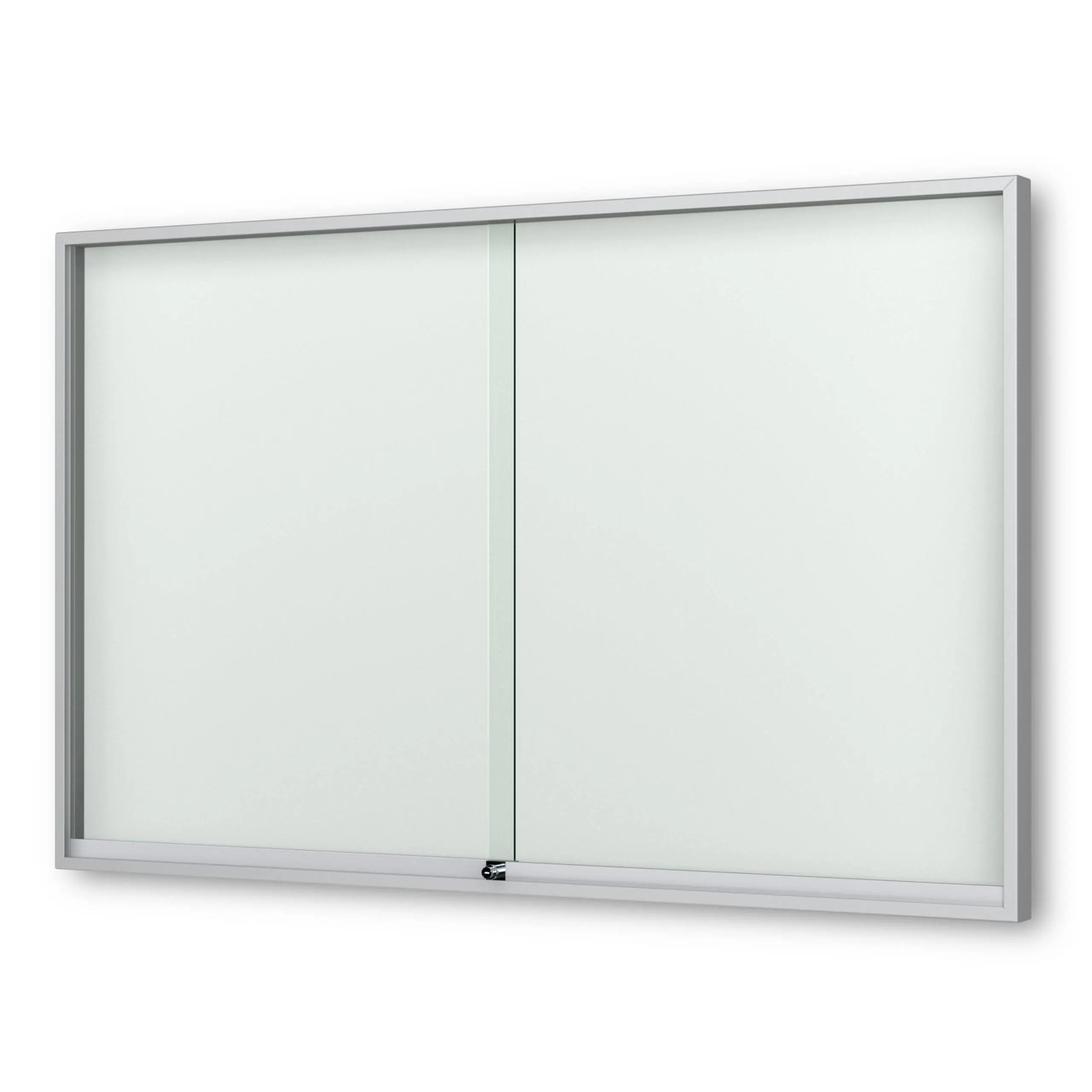 Schaukasten Fortis - eckig - mit Schiebetüren - 60 mm Gehäusetiefe, rollengelagerte Schiebetüren, höchster Brandschutz (A1) Größe - 8 × DIN A4 • 930 × 695 mm Öffnung - rollengelagerte SchiebetürenVerglasung - Einscheiben-Sicherheitsglas / ESGOberfläche - Eloxierung in matt-silber (E6/EV1)Beleuchtung - ohne BeleuchtungSchließung - Sicherheitsschlösser mit je 2 SchlüsselnRückwand - weiße, magnethaftende Rückwand inkl. 10 Magnete
